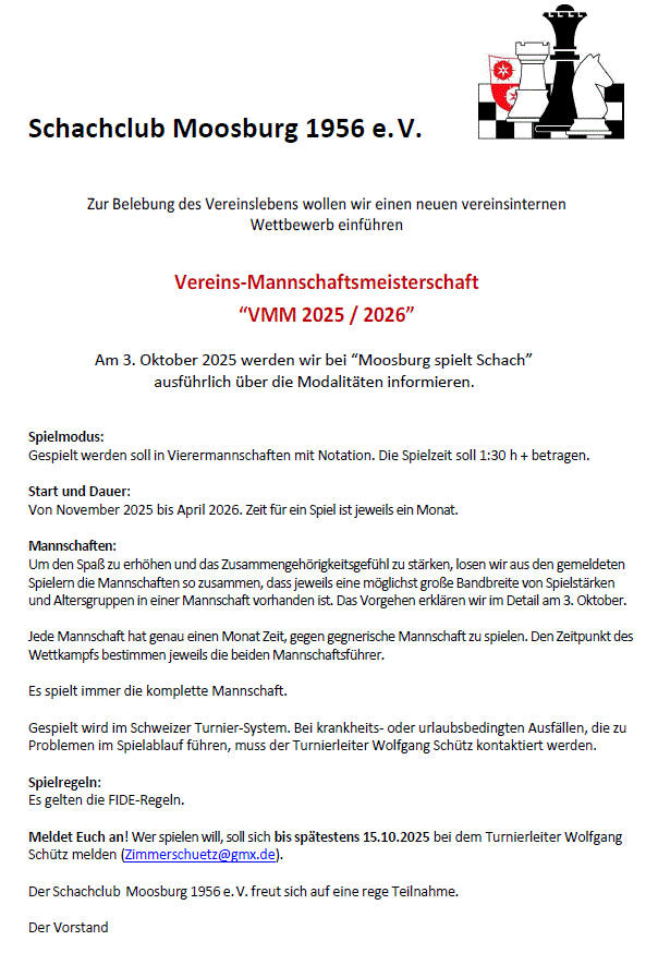 Der Schachclub Moosburg ist bestrebt im November 2025 eine Vereins-Mannschafts-Meisterschaft